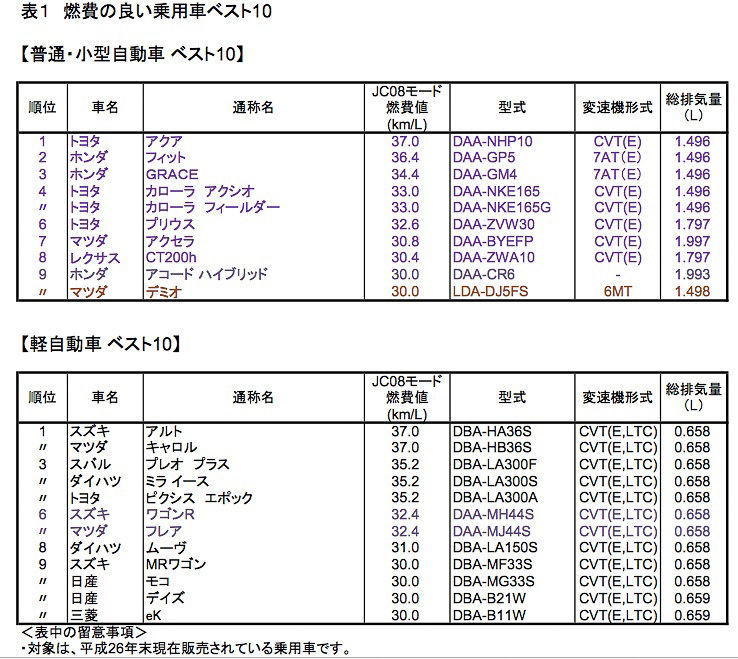 普通・小型自動車のベスト10では、1位は37.0km/Lのトヨタ「アクア」、2位は36.4km/Lのホンダ「フィット」、 3位は34.4km/Lのホンダ「グレイス」、4位が33.0km/Lのトヨタ「カローラ アクシオ」と「カローラ フィールダー」が並ぶ、 6位が32.6km/Lのトヨタ「プリウス」、7位が30.8km/Lのマツダ「アクセラ」、8位が30.4km/Lのレクサス「CT200h」、 9位が30.0km/Lのホンダ「アコード ハイブリッド」とマツダ「デミオ」が並んだ。