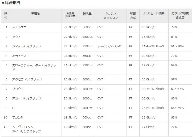 軽自動車のベスト10では、1位が37.0km/Lのスズキ「アルト」とマツダ「キャロル」の2台、 3位が35.2km/Lのスバル「プレオプラス」とダイハツ「ミライース」とトヨタ「ピクシス エポック」の3台が並び、 6位も32.4km/Lのスズキ「ワゴンR」とマツダ「フレア」の2台、8位が31.0km/Lのダイハツ「ムーヴ」、 9位は30.0km/Lのスズキ「MRワゴン」、日産「モコ」、日産「デイズ」、三菱「eK」の4台が並んだ。