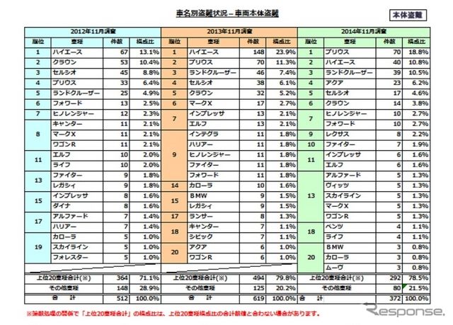 自動車盗難では、車種別で2007年調査から7年連続でワースト1位だったトヨタ『ハイエース』の被害が148件から40件に大幅減少し、2位となった。ハイエースは、2012年5月発売モデルから盗難防止装置であるイモビライザが全車標準装備されたことが大幅減少の背景にあると見られる。