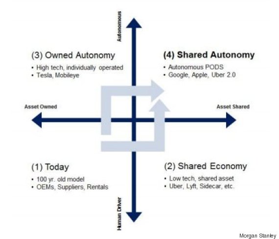 第4象限:「自動運転車を共有する」 これは、実現するであろう具体的な時期は不明だが、 自動車業界における進化の最終的な段階だ。大多数の人がほとんど例外なく「公共の自動運転車」か、 あるいは私営の自動運転車サービスを利用契約して乗るようになる。