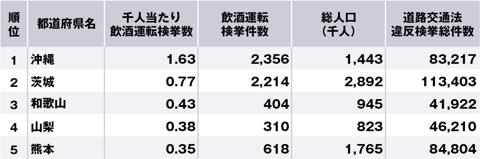 ※「飲酒運転検挙件数」「道路交通法違反検挙総件数」は警察庁「平成30年の犯罪」より。「総人口」は総務省統計局「人口推計」より、平成29年の推計人口。順位は小数点第3位以下も加味している。