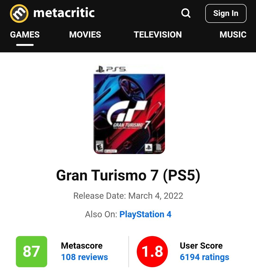 賭けてもいいぜ、ユーザースコア下り最速はSIEのGT7だ。
