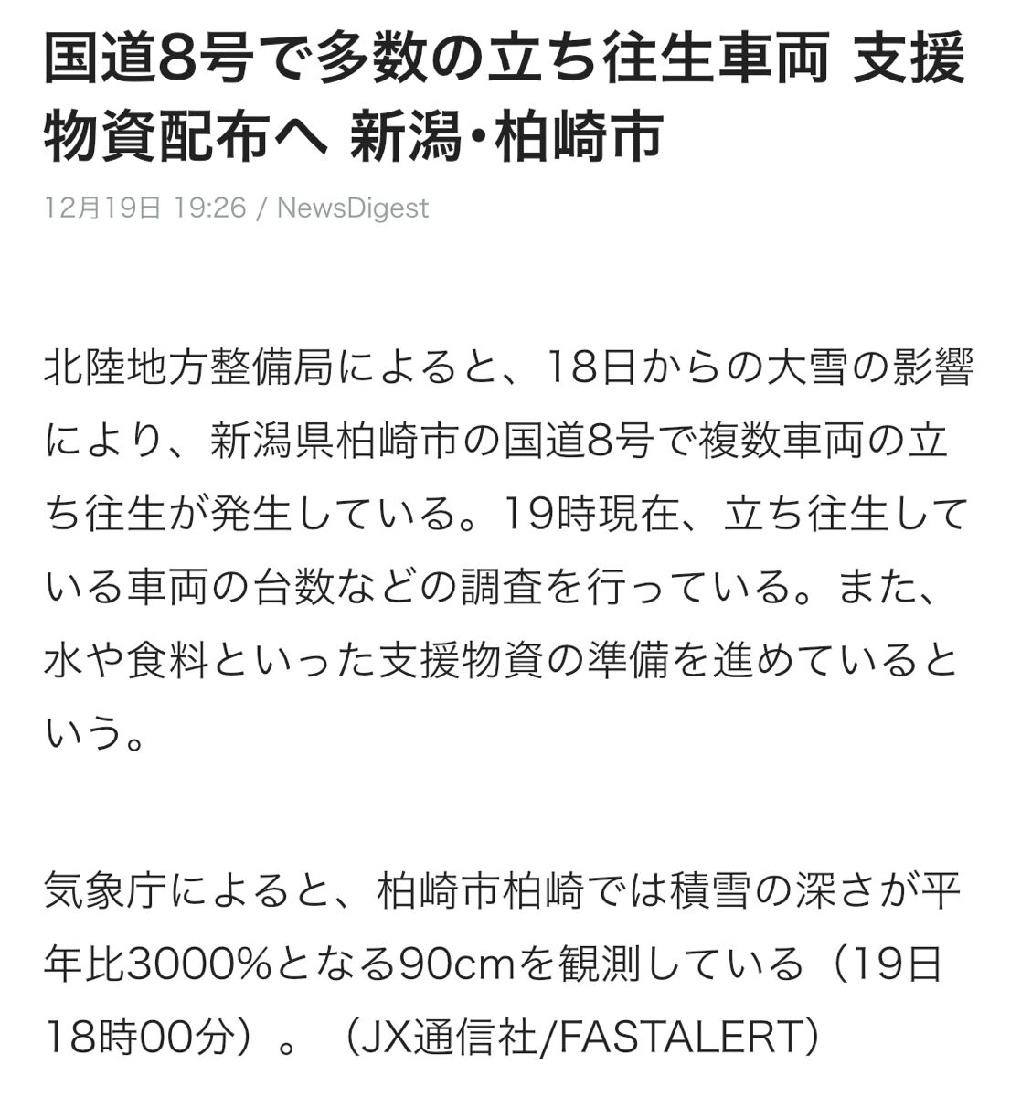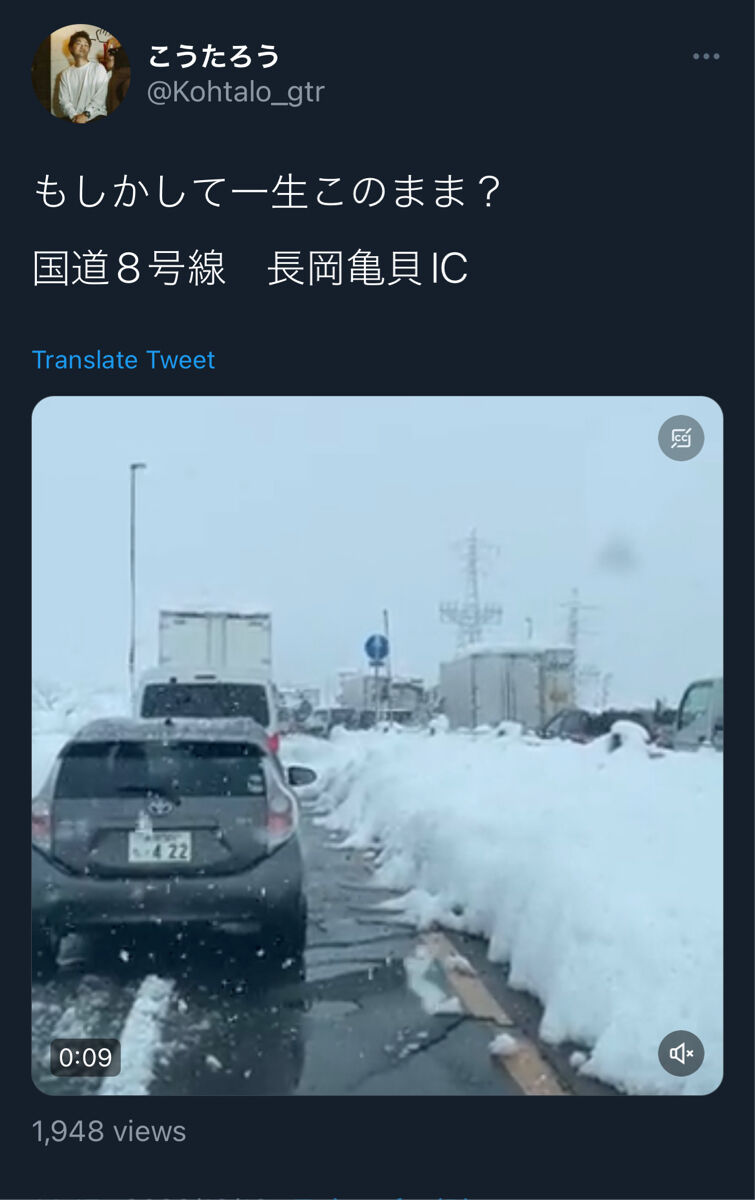 糸魚川に向けて出発してかれこれ13時間経ちます。いまだ柏崎です。道路上にいて運転手でもあるので睡眠すら取れませんFIFAさん責任とってください#立ち往生#国道8号#柏崎 pic.twitter.com/4lHHJtCWpB