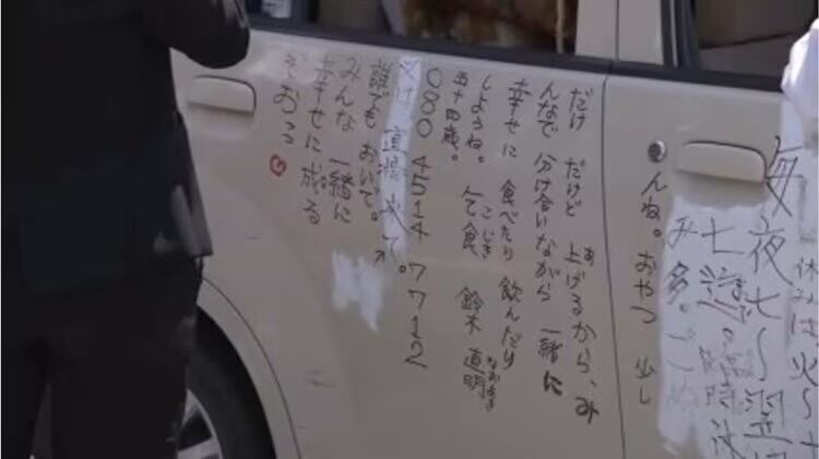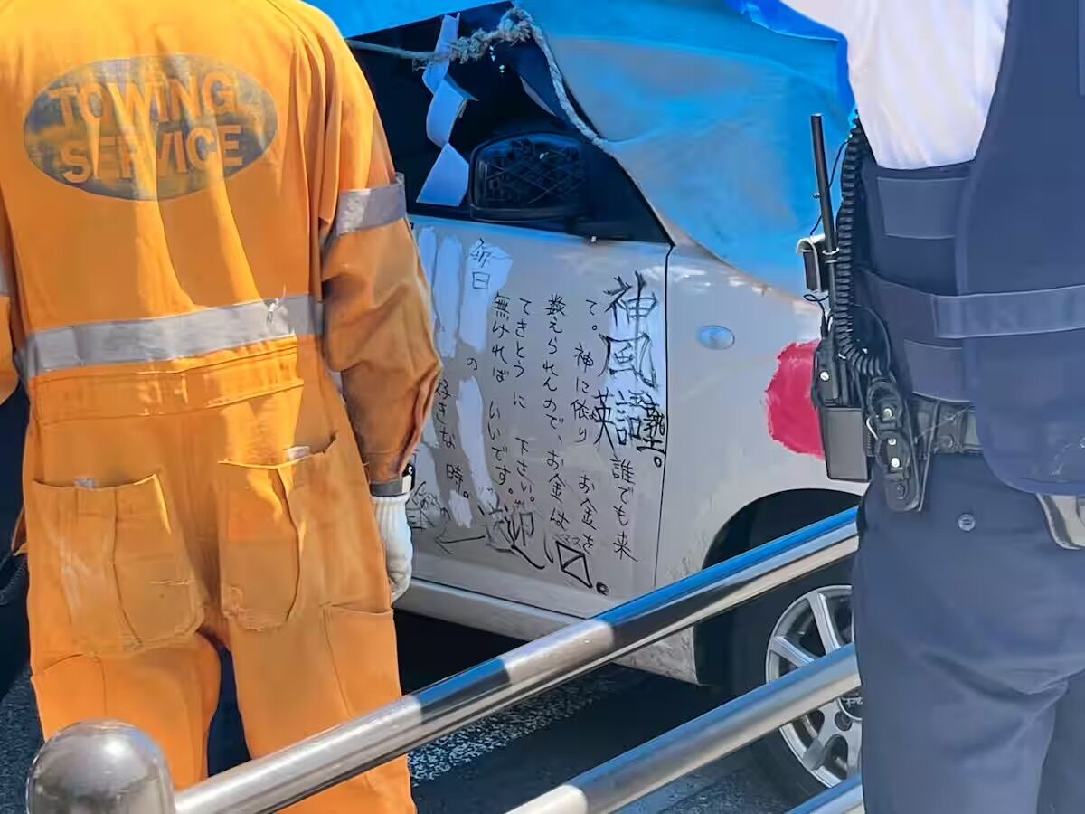 「神風」「たすけてあげるよ」などとたくさんの文字が書かれた車体。
