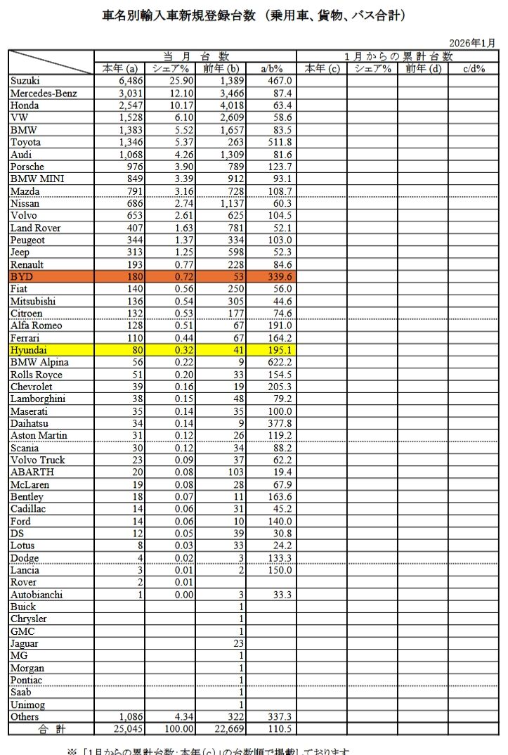 『日本自動車輸入組合』から2026年01月度の「輸入車新規登録台数(速報)」が公表されました。